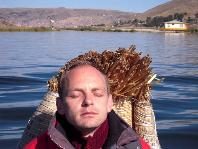 11: Reed Boat: The Uros people make boats out of reeds too. Kalasara, Sebastian, and Hoku enjoy a ride on one. Sebastian took the opportunity to float into the Ultra Greater Reality as can be seen here. :-)