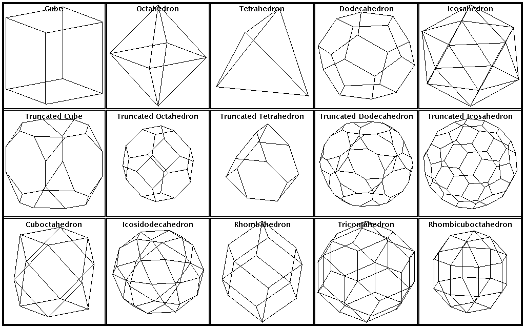 rotating at once. The top five shapes are the five Platonic Solids. The rest