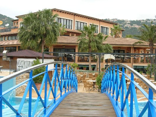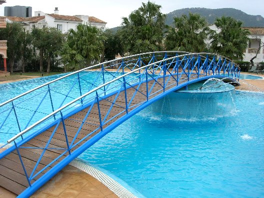 2: Hotel Bridge: The Hotel Mon Port features an outdoor swimming pool (actually three levels of pool), with a fountain in the middle, and this beautiful arch bridge crossing it. It's a bridge to the New! :-) Other views of the bridge can be seen here and here.