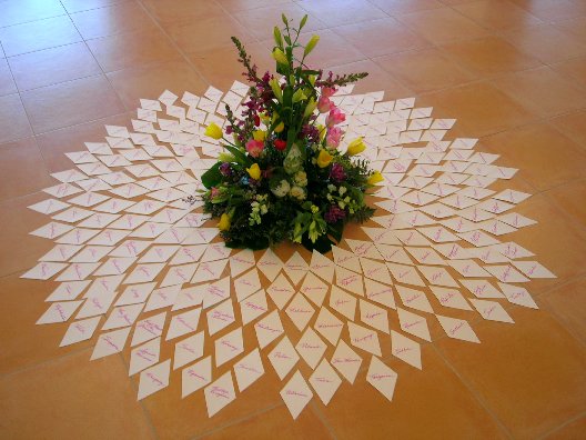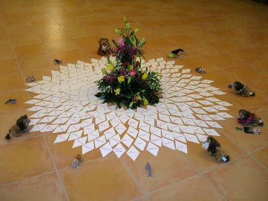 23: One World: Like at the 6th and 7th Gate Master Cylinders, we went through all the countries and regions of the world, activating our One Being and the Lotus Heart in each, laying a diamond shaped card for each around the flower arrangement. This was when the 8th Gate energies really start coming in. Another view can be seen here. Eventually people added lions and sea creatures (including one with a smiling tennis ball :-) around it, as can be seen here.