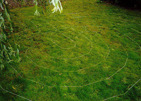 Labyrinth made on a lawn of a friend's place with string and nails, in the
