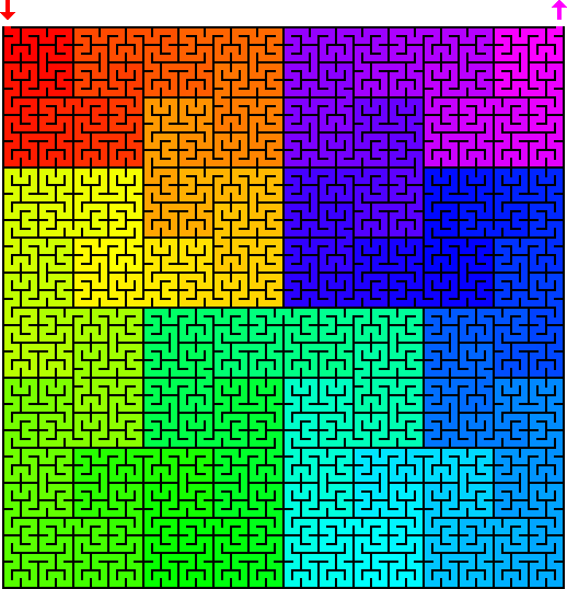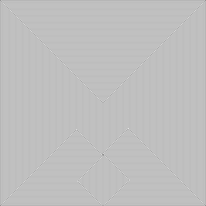 Bisection unicursal: This is a version of the passage bisection method of unicursal Maze generation, applied in a virtual manner. These unicursal Mazes are generated by taking a normal Maze, and bisecting each passage to get unicursal passages. To have the entrance of the unicursal Maze at one corner and the exit at the opposite corner, it's necessary to have a long passage along two adjacent edges of the standard Maze used to compose it. The standard Maze also needs to be able to be created virtually. The binary tree algorithm meets both criteria, so virtual unicursal Mazes can be created by bisecting virtual binary tree Maze passages. The bisection method of unicursal Maze generation can only be applied to 2D Mazes, so this is only available in 2D virtual Mazes.