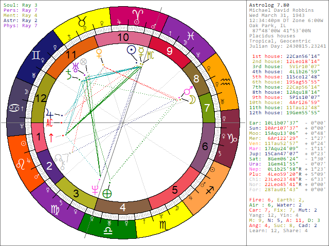 TARA stands for "Transpersonal Astro-Rayological Analysis", in which all of its modules guide one toward understanding their Rays. The original plan of Michael Robbins and Rick Good was to also include astrology modules, which would consider the Ray energies in one's astrological chart. Hence the "Astro-Rayological" part of the title. However, no astrology modules were ever added to it. Although not formal TARA modules, astrology software can be used to look at one's Rays. The free astrology program "Astrolog" can consider one's Ray energies, and includes the features below. Astrolog can be downloaded from: http://www.astrolog.org/astrolog/astfile.htm